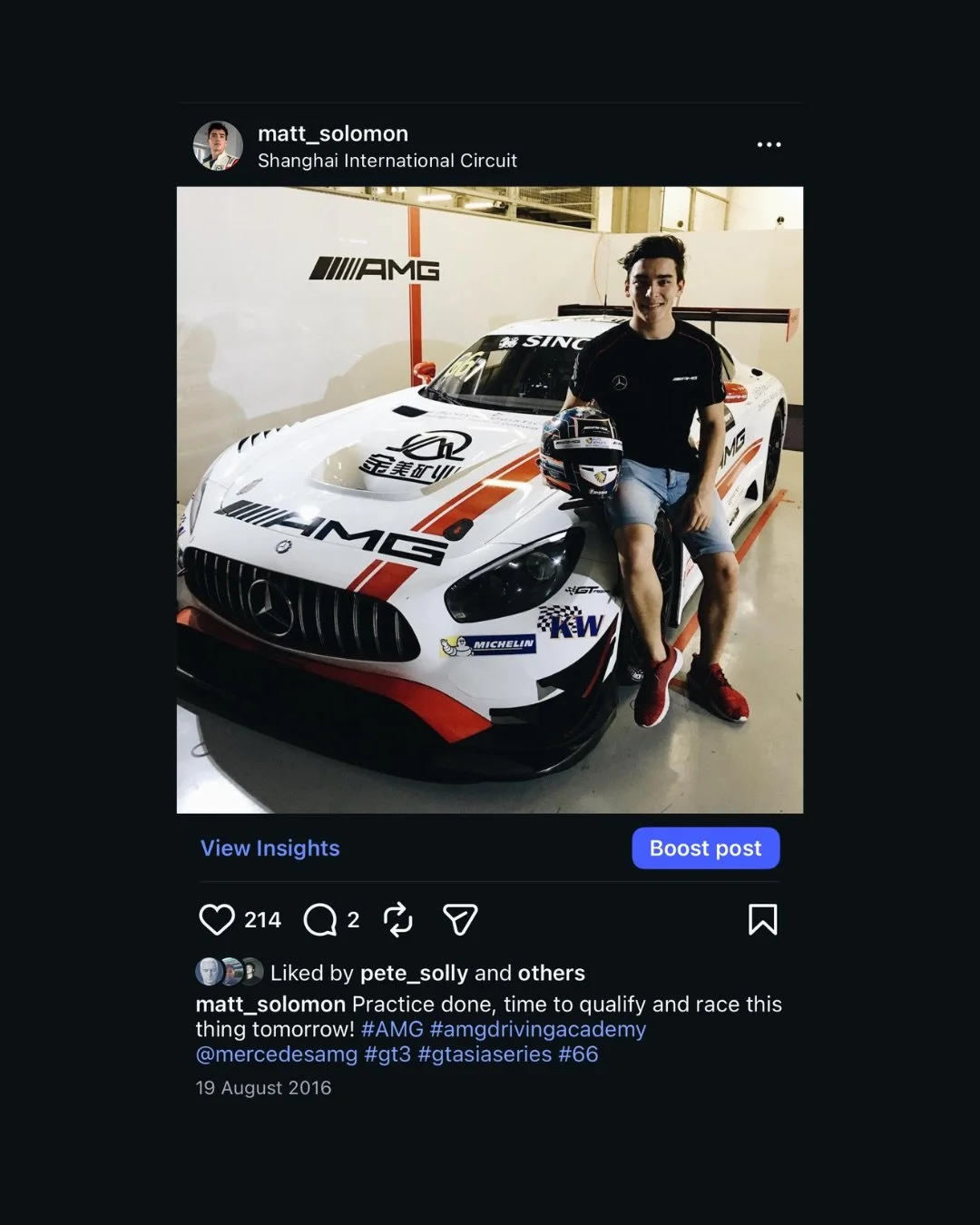 Matt began his motorsport career in karting, progressed through Formula 3, and now races in GT and one-make championships. After returning to competition, he uses his platforms to share the realities of racing — the progress, challenges, and the road back to the top.